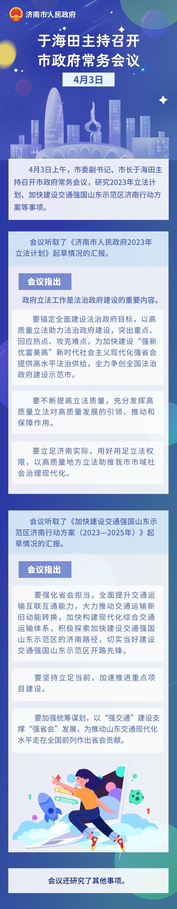 4月3日上午,市委副书记、市长于海田主持召开市政府常务会议,研究2023年立法计划、加快建设交通强国山东示范区济南行动方案等事项。