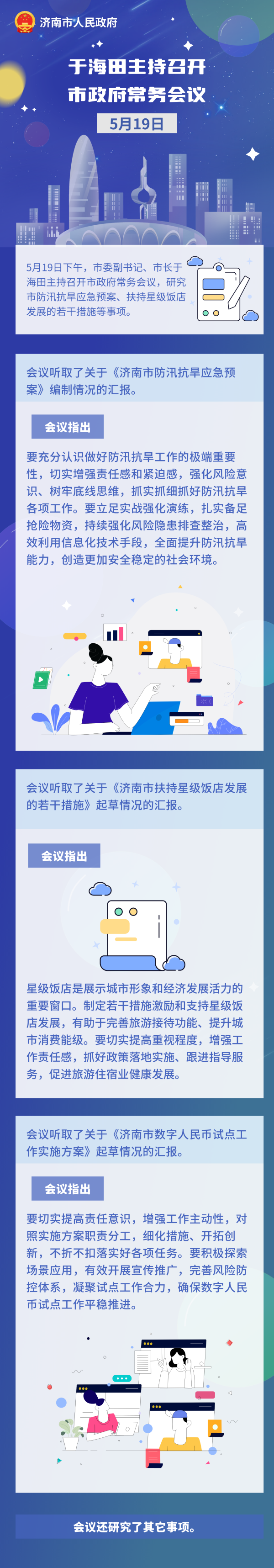 5月19日下午,市委副书记、市长于海田主持召开市政府常务会议,研究市防汛抗旱应急预案、扶持星级饭店发展的若干措施等事项。