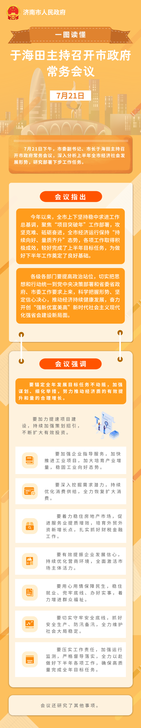 会议指出,今年以来,全市上下坚持稳中求进工作总基调,聚焦“项目突破年”工作部署,攻坚克难、砥砺奋进,全市经济运行保持“持续向好、量质齐升”态势,各项工作取得积极成效,较好完成了上半年目标任务,为做好下半年工作奠定了良好基础。各级各部门要提高政治站位,切实把思想和行动统一到党中央决策部署和省委省政府、市委工作要求上来,科学把握形势、坚定信心决心,推动经济持续健康发展,奋力开创“强新优富美高”新时代社会主义现代化强省会建设新局面。