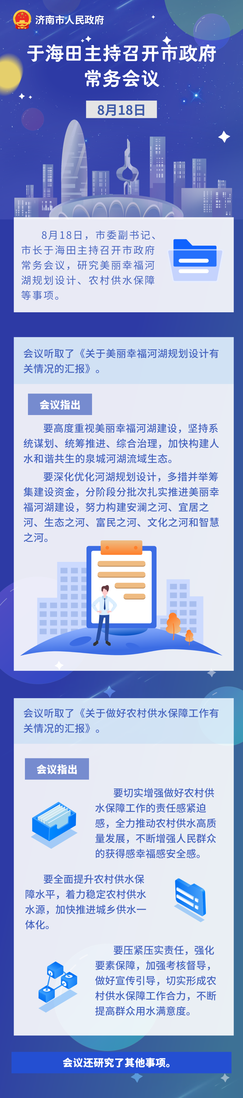 8月18日,市委副书记、市长于海田主持召开市政府常务会议,研究美丽幸福河湖规划设计、农村供水保障等事项。