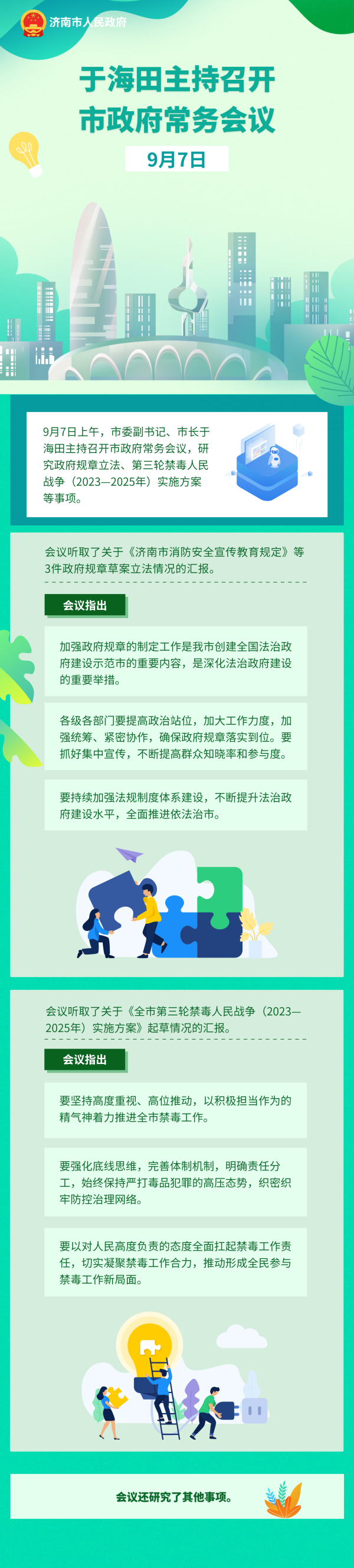 9月7日上午,市委副书记、市长于海田主持召开市政府常务会议,研究政府规章立法、第三轮禁毒人民战争(2023—2025年)实施方案等事项。