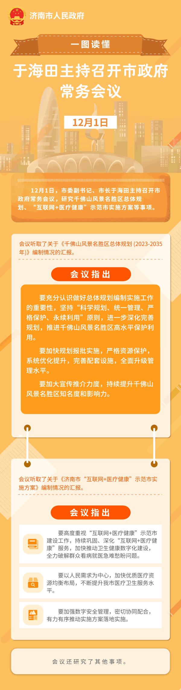 12月1日,市委副书记、市长于海田主持召开市政府常务会议,研究千佛山风景名胜区总体规划、“互联网+医疗健康”示范市实施方案等事项。