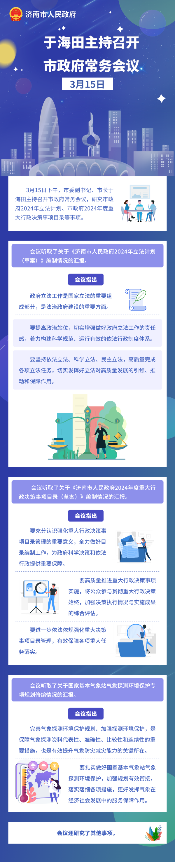 3月15日下午,市委副书记、市长于海田主持召开市政府常务会议,研究市政府2024年立法计划、市政府2024年度重大行政决策事项目录等事项。
