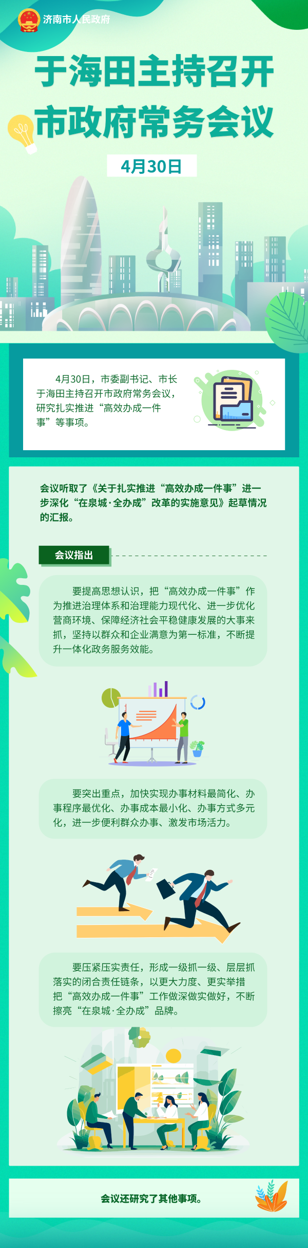 4月30日,市委副书记、市长于海田主持召开市政府常务会议,研究扎实推进“高效办成一件事”等事项。
