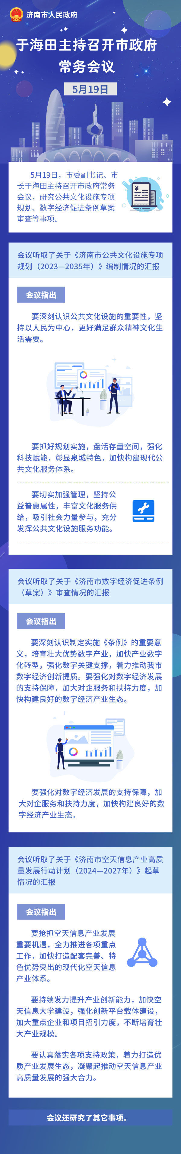 5月19日,市委副书记、市长于海田主持召开市政府常务会议,研究公共文化设施专项规划、数字经济促进条例草案审查等事项。