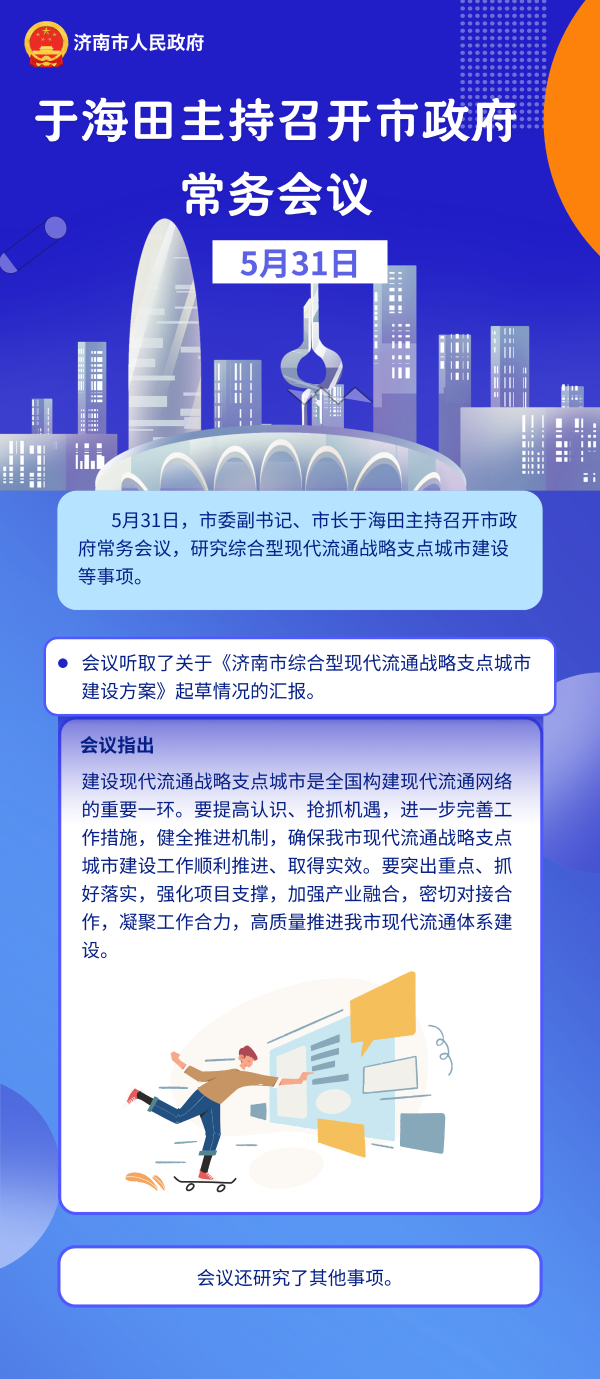 5月31日,市委副书记、市长于海田主持召开市政府常务会议,研究综合型现代流通战略支点城市建设等事项。