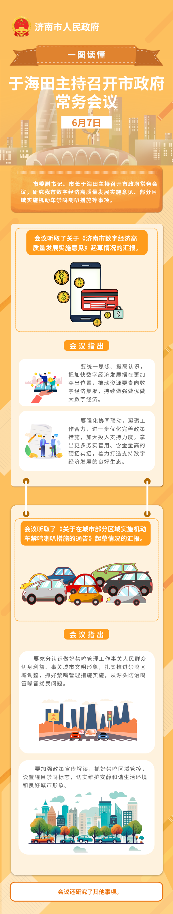6月7日,市委副书记、市长于海田主持召开市政府常务会议,研究我市数字经济高质量发展实施意见、部分区域实施机动车禁鸣喇叭措施等事项。