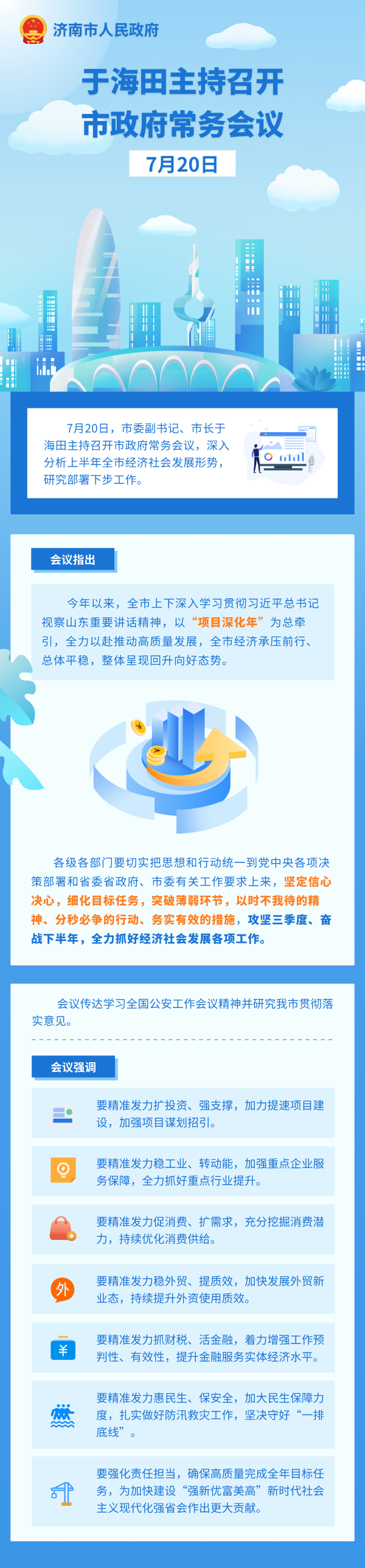 7月20日,市委副书记、市长于海田主持召开市政府常务会议,深入分析上半年全市经济社会发展形势,研究部署下步工作。