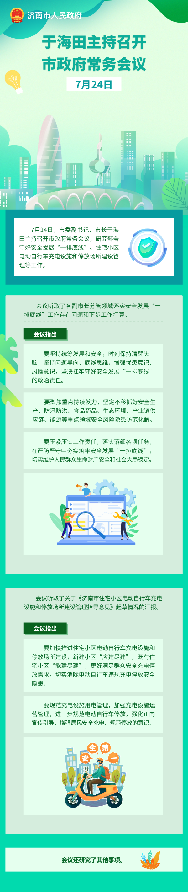 7月24日,市委副书记、市长于海田主持召开市政府常务会议,研究部署守好安全发展“一排底线”、住宅小区电动自行车充电设施和停放场所建设管理等工作。