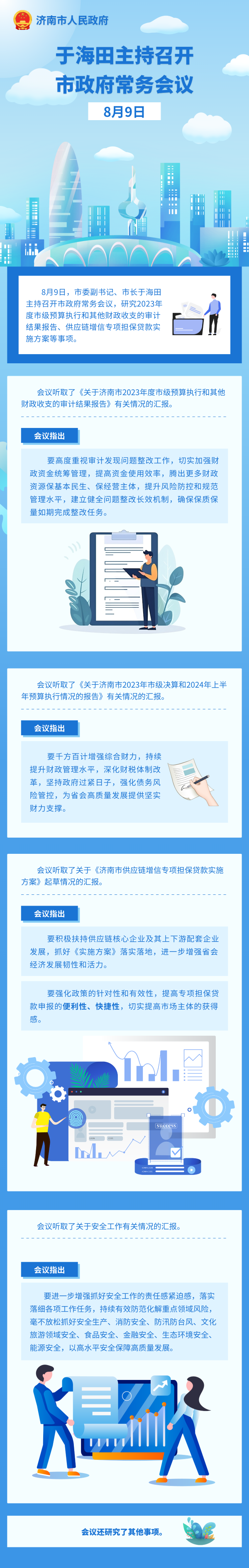 8月9日,市委副书记、市长于海田主持召开市政府常务会议,研究2023年度市级预算执行和其他财政收支的审计结果报告、供应链增信专项担保贷款实施方案等事项。