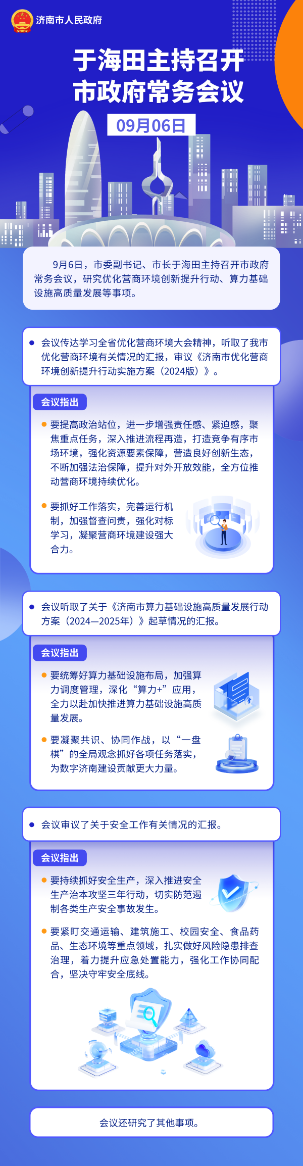 9月6日,市委副书记、市长于海田主持召开市政府常务会议,研究优化营商环境创新提升行动、算力基础设施高质量发展等事项。