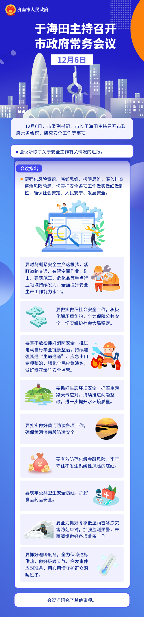 会议听取了关于安全工作有关情况的汇报。会议指出,要强化风险意识、底线思维、极限思维,深入排查整治风险隐患,切实把安全各项工作做实做细做到位,确保社会安定、人民安宁、发展安全。要时刻绷紧安全生产这根弦,紧盯道路交通、有限空间作业、矿山、建筑施工、危化品等重点行业领域持续发力,全面提升安全生产工作能力水平。要做实做细社会安全工作,积极化解矛盾纠纷,全力保障公共安全,切实维护社会大局稳定。要毫不放松抓好消防安全,推进电动自行车全链条整治,持续加强畅通“生命通道”、应急出口专项整治,强化全民应急演练,做好烟花爆竹安全监管。要抓好生态环境安全,抓实重污染天气应对,持续推进问题整改,进一步提升水环境质量。要扎实做好黄河防凌各项工作,确保黄河济南段防凌安全。要有效防范化解金融风险,牢牢守住不发生系统性风险的底线。要筑牢公共卫生安全防线,抓好食品药品安全。要全力抓好冬季低温雨雪冰冻灾害防范应对,加强监测预警,未雨绸缪做好各项准备工作。要抓好迎峰度冬,全力保障达标供热,做好极端天气、突发事件应对准备,用心用情守护群众温暖过冬。
