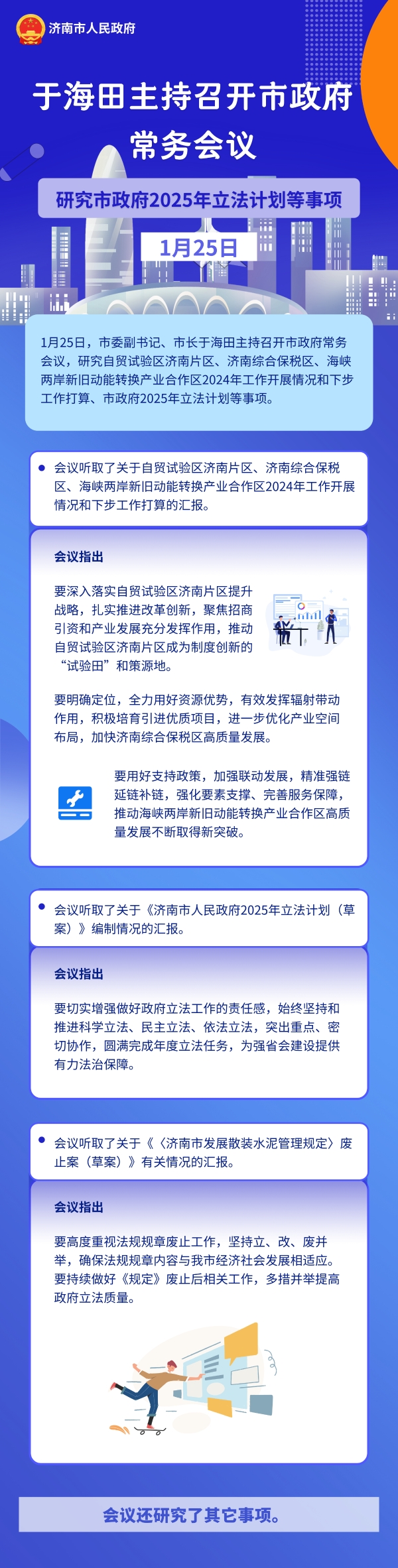 1月25日,市委副书记、市长于海田主持召开市政府常务会议,研究自贸试验区济南片区、济南综合保税区、海峡两岸新旧动能转换产业合作区2024年工作开展情况和下步工作打算、市政府2025年立法计划等事项。