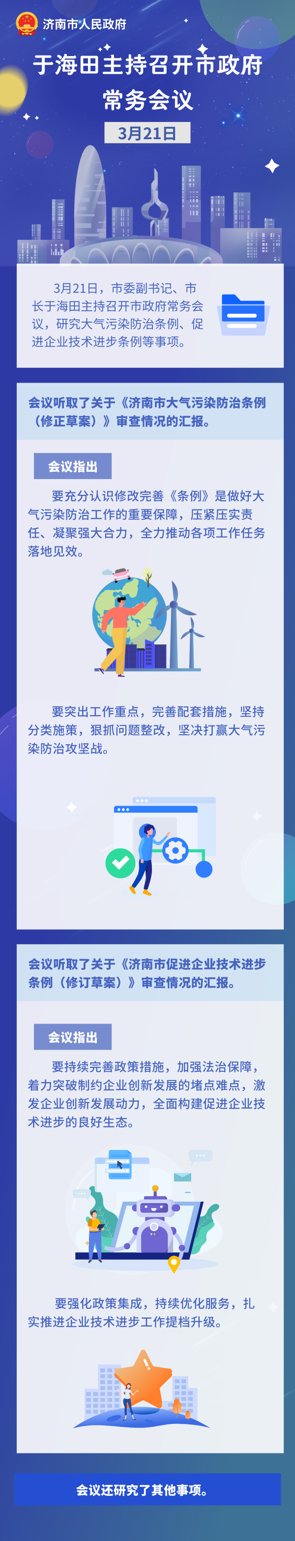 3月21日,市委副书记、市长于海田主持召开市政府常务会议,研究大气污染防治条例、促进企业技术进步条例等事项。