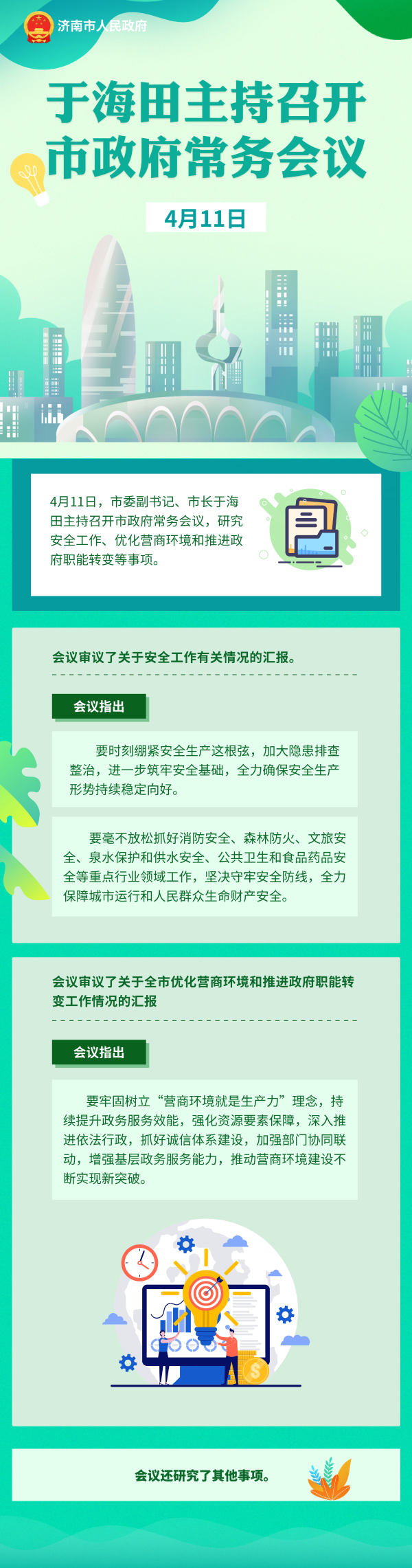 4月11日,市委副书记、市长于海田主持召开市政府常务会议,研究安全工作、优化营商环境和推进政府职能转变等事项。
