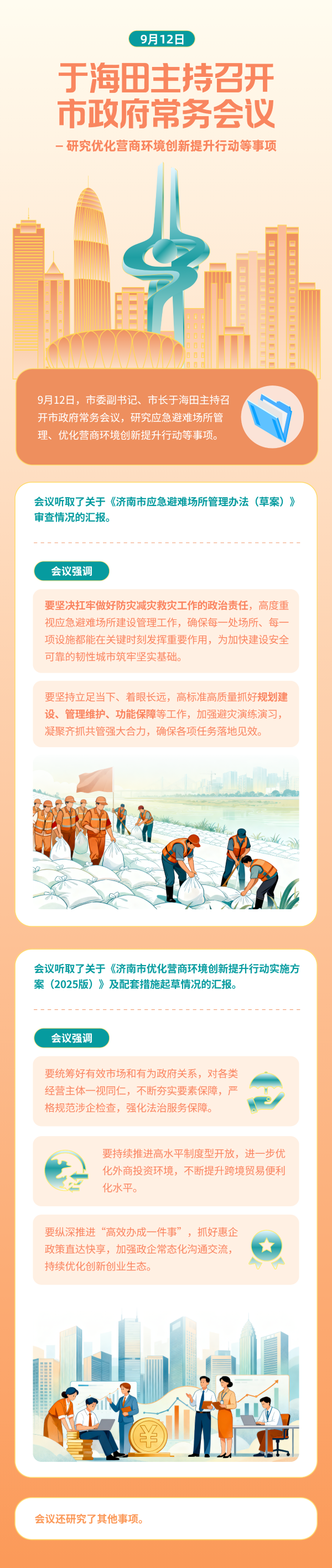 9月12日,市委副书记、市长于海田主持召开市政府常务会议,研究应急避难场所管理、优化营商环境创新提升行动等事项。