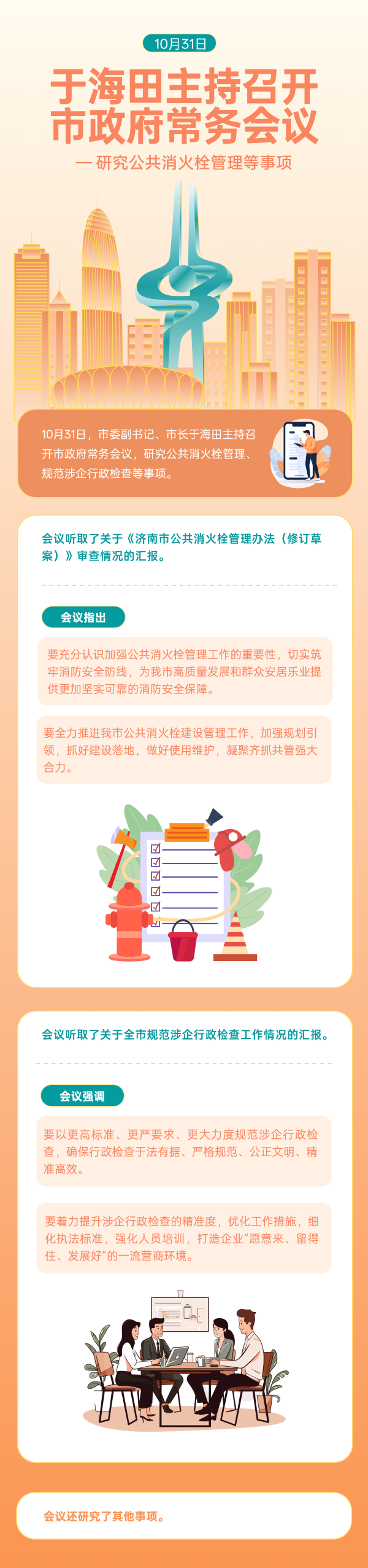 10月31日,市委副书记、市长于海田主持召开市政府常务会议,研究公共消火栓管理、规范涉企行政检查等事项。
