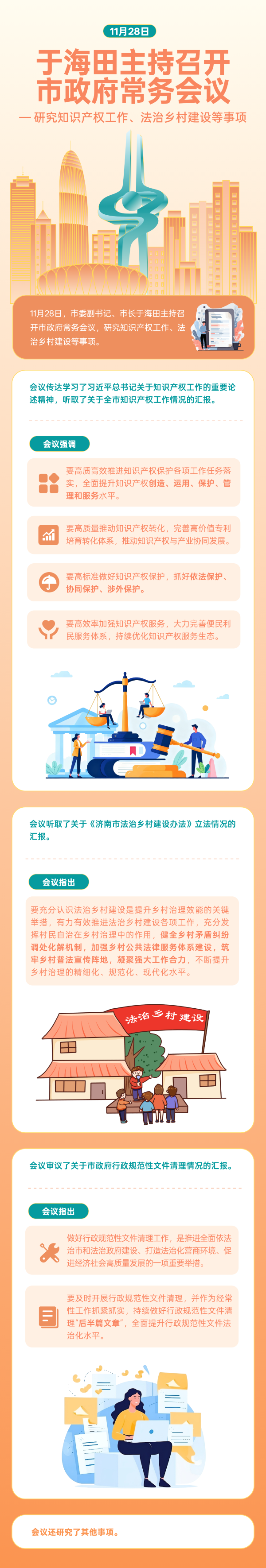 11月28日,市委副书记、市长于海田主持召开市政府常务会议,研究知识产权工作、法治乡村建设等事项。