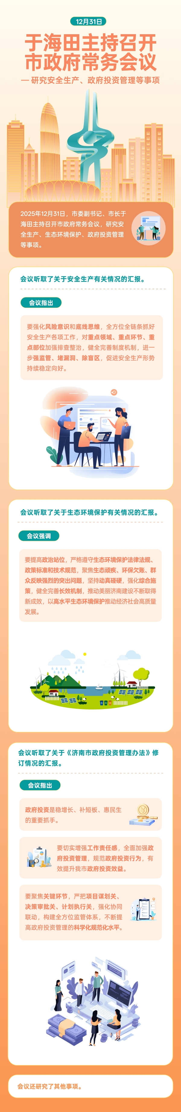 2025年12月31日,市委副书记、市长于海田主持召开市政府常务会议,研究安全生产、生态环境保护、政府投资管理等事项。