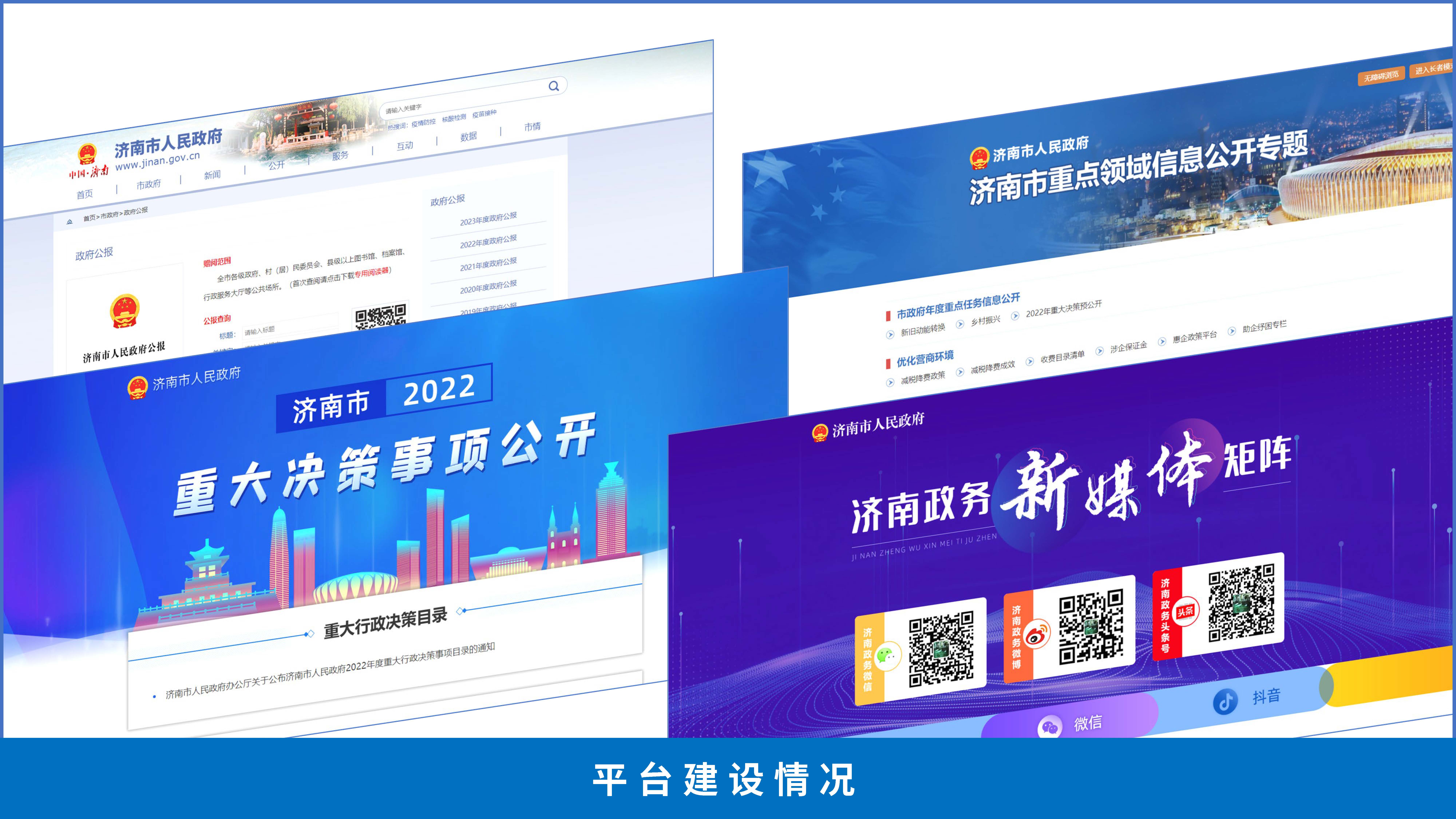 (四)平台建设情况。一是做好公报发布工作。全年发布《济南市人民政府公报》22期(合刊2期),在政府门户网站设置政府公报电子版专栏,可在线查阅2005年以来的政府公报。在新华社总网客户端、新华网山东频道、新华网济南公报专栏发布公报信息180余篇(次),每篇阅读达230万人次,全年累计阅读超2亿人次。二是充分发挥市政府门户网站信息公开第一平台的作用。完善政府网站栏目设置,建立优化营商环境、重大决策预公开等多个专题专栏,切实为群众提供优质、高效的政务公开体验。三是政务新媒体规范有序发展。“微博济南”“济南政务头条号”“济南政务微信号”市级政务新媒体账号全年发布信息9601条,累计阅读量为5843.2万,总粉丝数达186.6万。