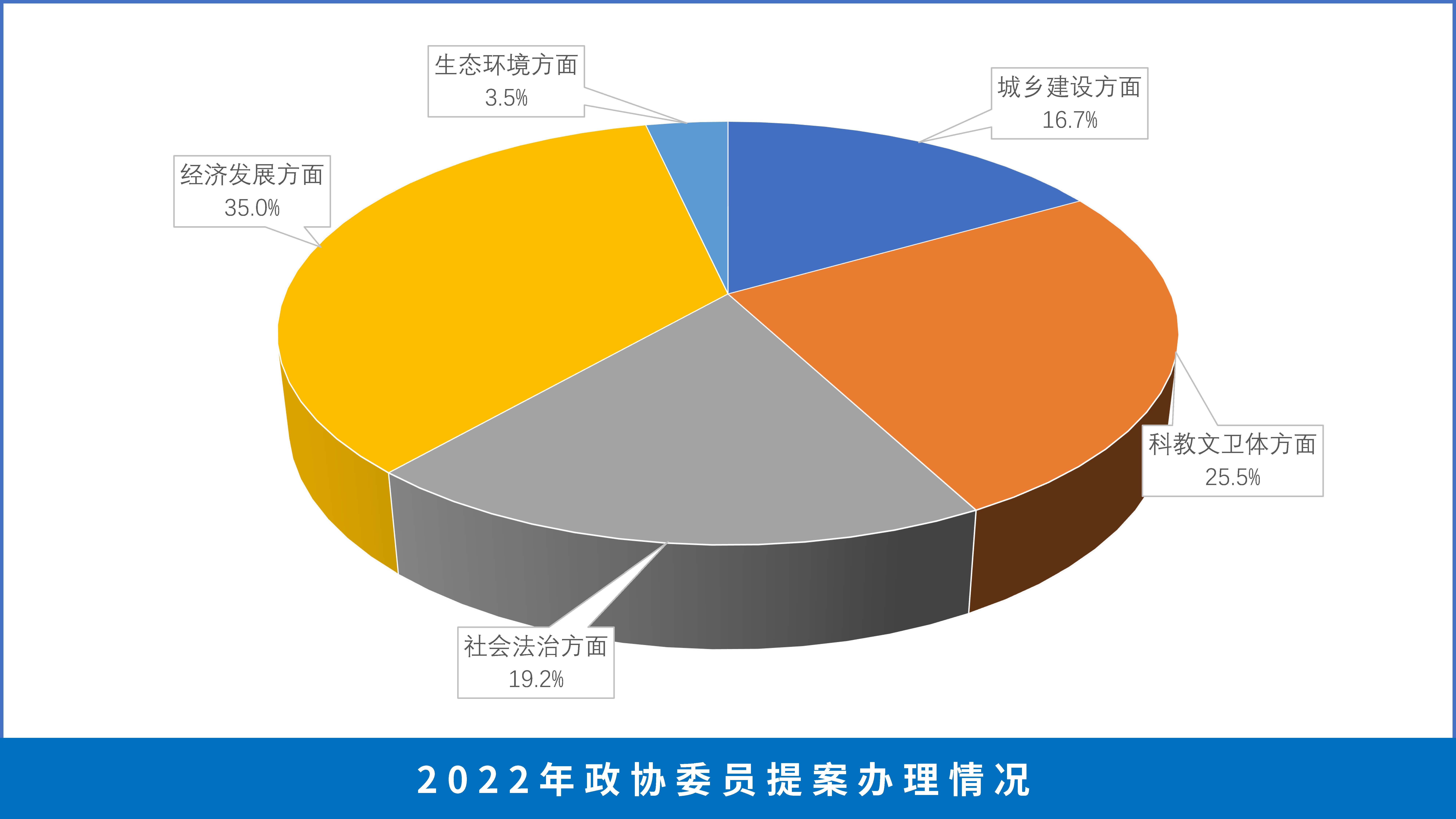 市政协十五届一次会议以来,全市承办市政协委员提案共568 件,已全部办理完毕。其中,城乡建设方面95件,占16.7%;科教文卫体方面145件,占25.5%;社会法治方面109件,占19.2%;经济发展方面199件,占35.0%;生态环境方面20件,占3.5%。从委员反馈情况看,满意率达99%以上。