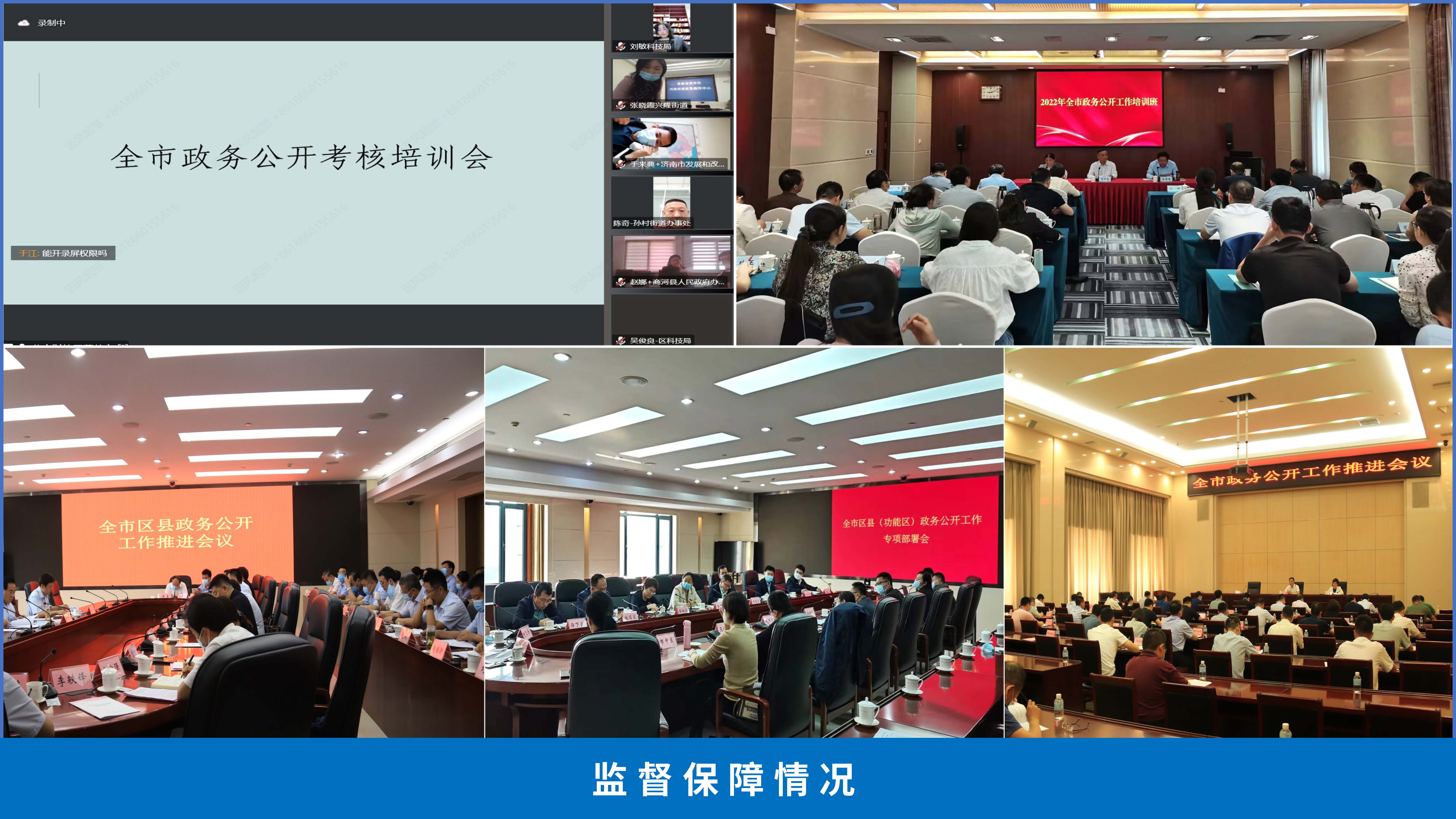 (五)监督保障情况。一是强化考核督查。印发《2022年济南市政务公开工作要点》,明确重点工作和任务分工,定期开展工作督查,精心组织政务公开工作考核,细化考核标准,引导各单位着力解决问题难点,全年共开展专项督查19次,督查整改问题3125项。二是强化业务培训。全年组织开展线上线下政务公开业务培训33次,其中市级层面开展业务培训3次,培训范围覆盖各区县政府、市政府各部门工作人员超过1000人。