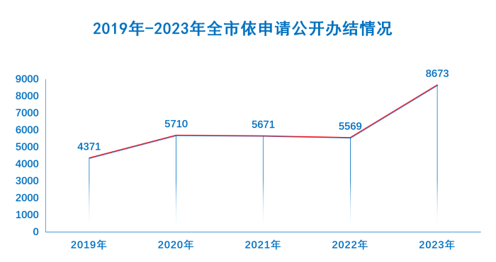 (二)加强制度体系建设,依申请公开办理更加规范。进一步规范全市依申请公开件接收、登记、办理、调查、答复等各流程环节,统一告知书文本样式,通过邮寄、网上申请等方式对各区县、部门进行暗访督导,并指导整改落实,切实提升依申请公开办理质量。2023年新收到政府信息公开申请8776件,2022年结转至2023年办理92件,共计8868件;按规定结转至2024年继续办理195件,2023年共依法办结8673件。从申请内容看,主要涉及城市更新、征收拆迁、土地出让、城乡规划等方面。因政府信息公开产生行政复议185件,未经复议直接起诉345件,复议后起诉9件。