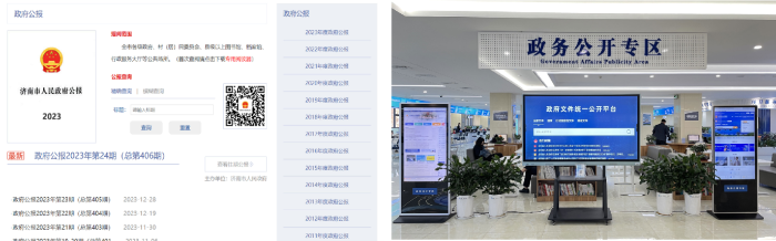 (四)着眼拓宽公开渠道,平台建设更加完善。一是推进门户网站改版升级,做优做强政务公开第一平台,重点强化信息发布、解读回应、办事服务、互动交流四项功能。二是推进政府公报创新发展,进一步优化政府公报编辑发行工作,全年编辑出版《济南市人民政府公报》24期,每期发行量1.3万余册,刊登各类文件94件,近56万字;进一步优化公报电子版阅读界面,提供电子版下载服务,方便公众获取。三是推进政务公开专区优化提升,高标准打造市、区两级政务公开专区,在专区滚动播出政务公开宣传片、政策解读视频等内容,让群众面对面、零距离了解相关政策信息。