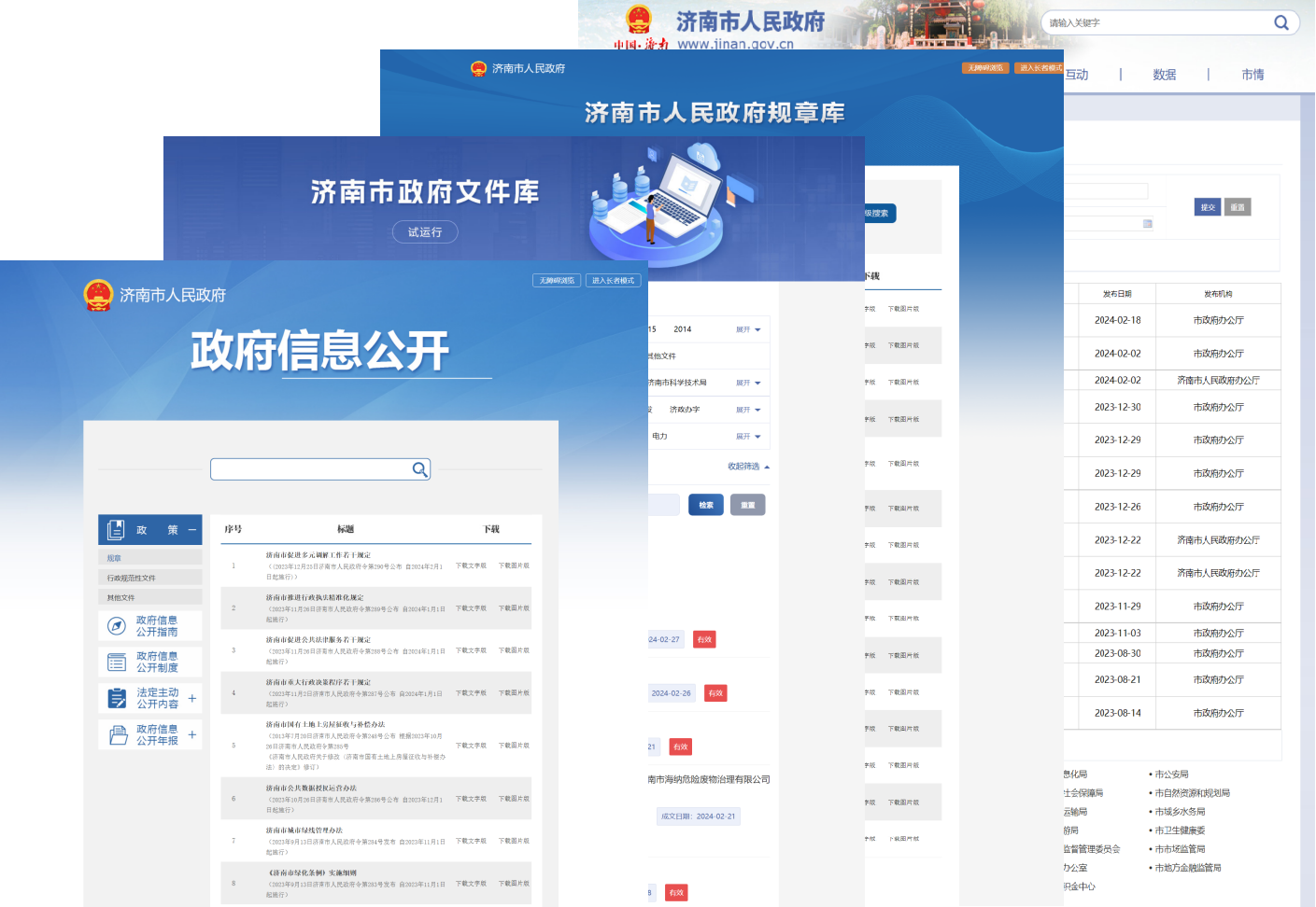 重大行政决策专题页面以年份时间轴全流程公开,层次清晰、直观明确;推进政务新媒体健康有序发展,理顺政务新媒体管理体制机制,着力提升信息发布、解读回应、政民互动、办事服务整体水平;研究提升基层政务公开工作质效,不断畅通群众诉求表达渠道,先后打造历下区政务微点单专区、“公开微历”社区发布中心,莱芜区“莱公开、强服务”品牌、“莱惠企”政策专区,长清区“就近知”政务公开等基层政务公开品牌;