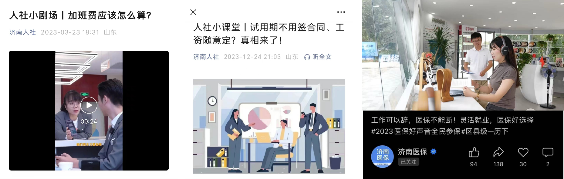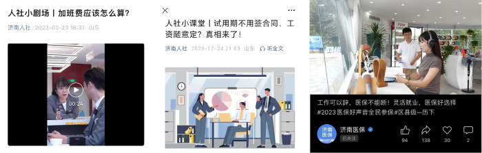 三是创新开展情景剧解读。聚焦提高政策解读实效,部分市直部门从受众群体角度出发,运用受众群体熟悉的语言,利用短视频、动漫、情景剧等形式,推出一系列政策解读情景剧。市人力资源社会保障局依托“济南人社”订阅号,创新开设“人社小剧场”“人社小课堂”“工伤预防小贴士”等板块,围绕就业创业、社会保障、人事人才、劳动关系等民生关注事项,推出短视频350余期,阅读量超百万。市医保局利用“济南医保”微信服务号制作群众关注热点问题情景剧、动画、采访解说、曲艺作品系列短视频45个,广受好评。