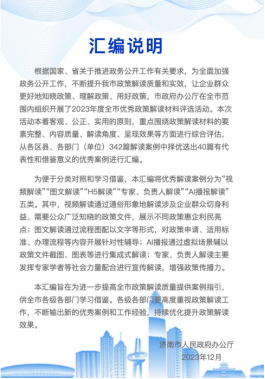 本年度报告根据《中华人民共和国政府信息公开条例》和《国务院办公厅政府信息与政务公开办公室关于印发<中华人民共和国政府信息公开工作年度报告格式>的通知》(国办公开办函〔2021〕30号)相关要求编制,内容包括总体情况、主动公开政府信息情况、收到和处理政府信息公开申请情况、政府信息公开行政复议和行政诉讼情况、存在的主要问题及改进情况、其他需要报告的事项等六个部分。本年度报告中所列数据统计期限从2023年1月1日到2023年12月31日。本年度报告电子版可从济南市人民政府门户网站“中国·济南”(www.jinan.gov.cn)查阅或下载。公众如需进一步咨询了解其他相关信息,请与济南市人民政府办公厅联系(地址:济南市历下区龙鼎大道1号,电话:0531-51707772)。