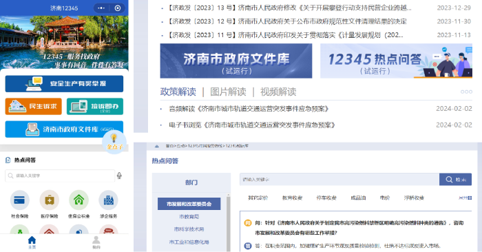 二是探索推进“公开+12345热线”融合发展。创新探索“线上+线下”“政务公开+12345”合作模式,聚焦企业群众高频诉求,市政府门户网站“12345热线热点问答”专栏(包含45个部门的市民12345热点问答)、12345热线微信服务号市政府文件库和12345热线微信小程序市政府文件库分别上线试运行,市民在反映诉求的同时,可直接通过“济南市政府文件库”查阅相关政策文件。根据企业群众热点诉求有针对性的加大相关政策推送、解读力度,利用政府开放日、政企互动平台等公开渠道,以公开促服务、以公开促解决、以公开促治理,进一步提高政务公开的主动性、精准性和时效性。