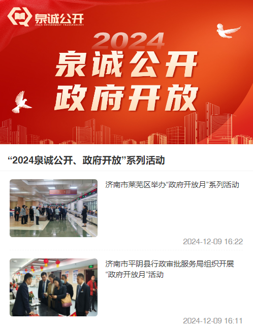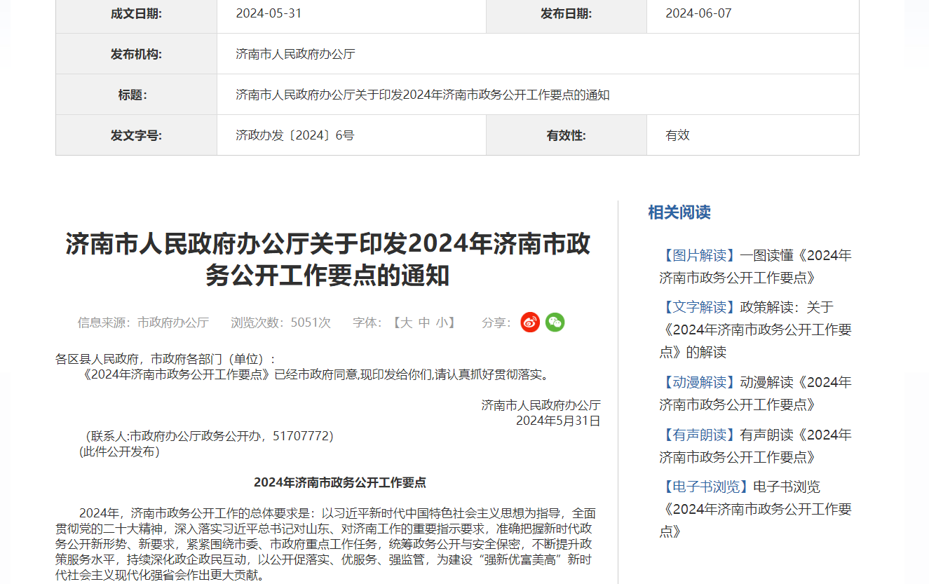 按照《2024年山东省政务公开工作要点》(鲁政办发〔2024〕2号)工作要求,结合济南市实际,市政府办公厅出台了《2024年济南市政务公开工作要点》(济政办发〔2024〕6号),进一步明确2024年济南市政务公开工作的总体要求、重点任务和责任分工,要求准确把握新时代政务公开新形势、新任务、新要求,更好发挥政务公开功能作用,以高质量政务公开推动经济社会高质量发展;通过制定责任清单,进一步细化任务执行的具体步骤与时间节点,对全年政务公开工作核心任务和工作目标进行分解和明确;通过持续深化政企政民互动,让政企政民沟通交流更顺畅,进一步推动政务公开工作向纵深发展;通过建立健全监督机制,进一步加强监督检查,严格落实责任追究制度,确保工作任务得到有效执行与落实。