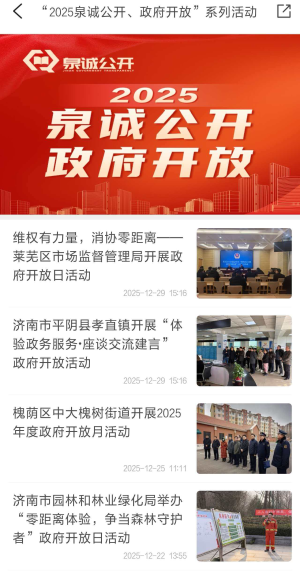 2.创新开展“问题解决型”政府开放活动。年初下发《关于征集2025年“泉诚公开 政府开放”活动计划的通知》,面向各级各部门征集2025年度“泉诚公开 政府开放”活动计划;鼓励各单位围绕城市管理、民生保障等领域的重难点问题,开展“问题解决型”政府开放活动。通过座谈交流、现场答疑等形式,邀请企业、群众共同为城市发展建言献策,推动一批实际问题得到解决。以“泉诚公开 政府开放”为主题,全年组织开展各类政府开放活动510余场;在市政府和各区县政府网站统一上线“政府开放活动”专栏,相关经验做法形成稿件《政务公开“全景窗”,照见民生温度与治理效能》在《大众日报》刊发,品牌集成效应和活动影响力持续扩大。