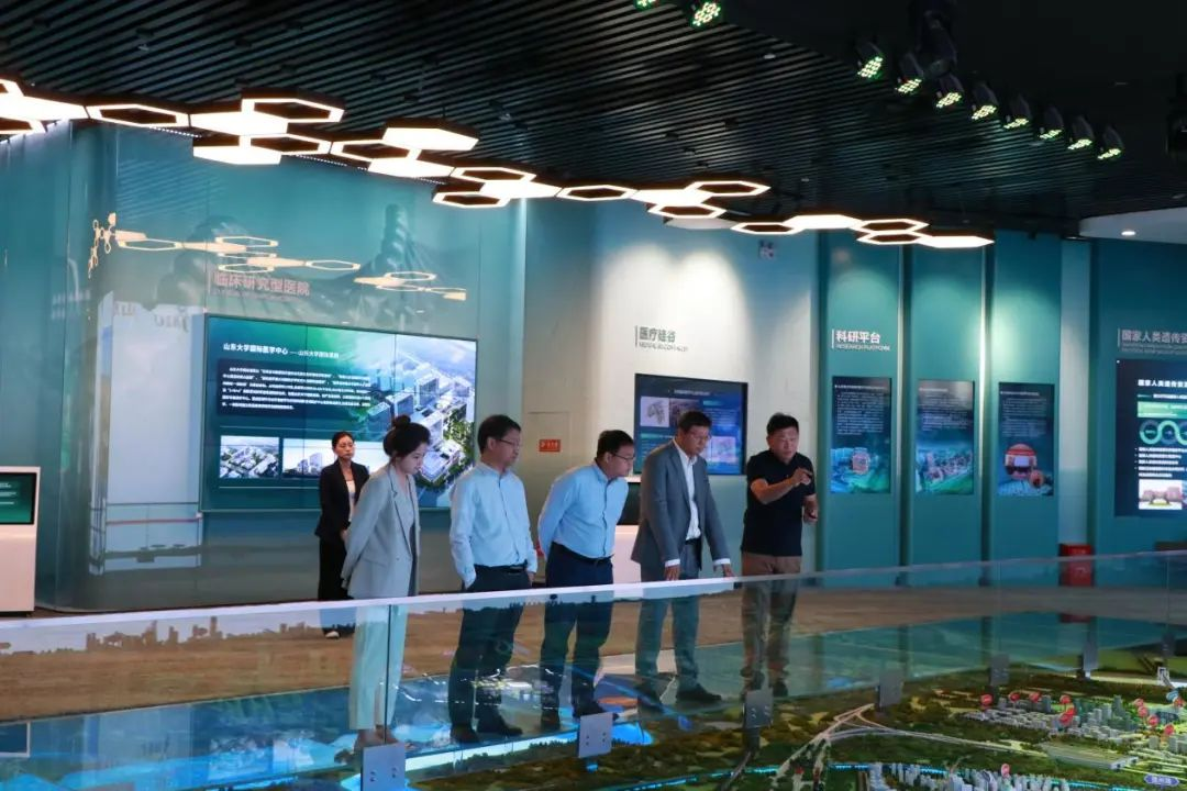 刘道志一行首先参观了医学中心综合展厅,听取园区整体规划设计、功能布局、项目建设、平台打造等相关情况介绍。随后车览医疗硅谷片区项目,了解树兰(济南)医院、山东第一医科大学、山东中医药大学国际眼科与视光医学院项目进展情况,并参观济南精准医学产业园。