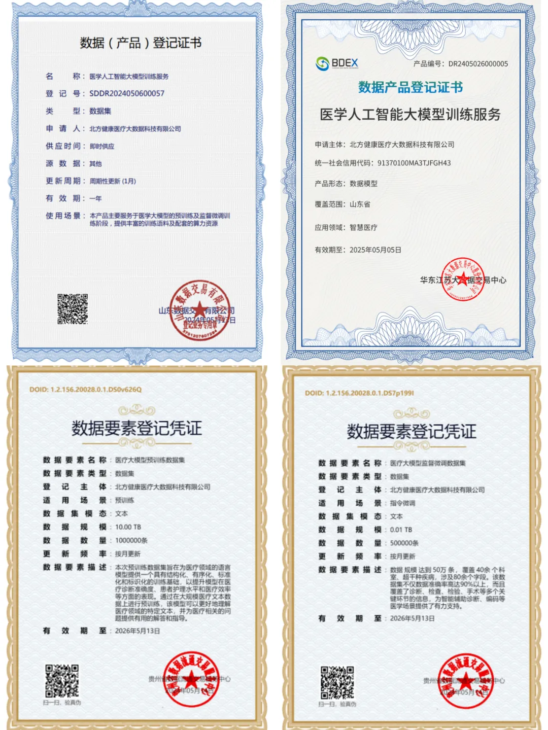 目前,该数据集衍生出的医疗大模型预训练数据集、监督微调数据集及医学事件知识图谱等数据产品,获得全国首张医学大模型领域的数据知识产权登记证书,并入选国家知识产权局全国十大数据知识产权典型案例,已在山东、北京、贵阳、江苏等我国多个数据交易所合规上架,赋能医疗机构与科研单位,加速医疗数据从资源到价值的全链条转化,引领行业协同创新。