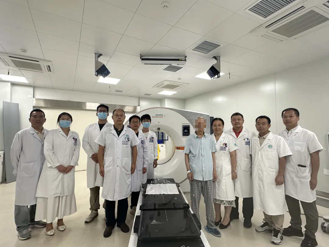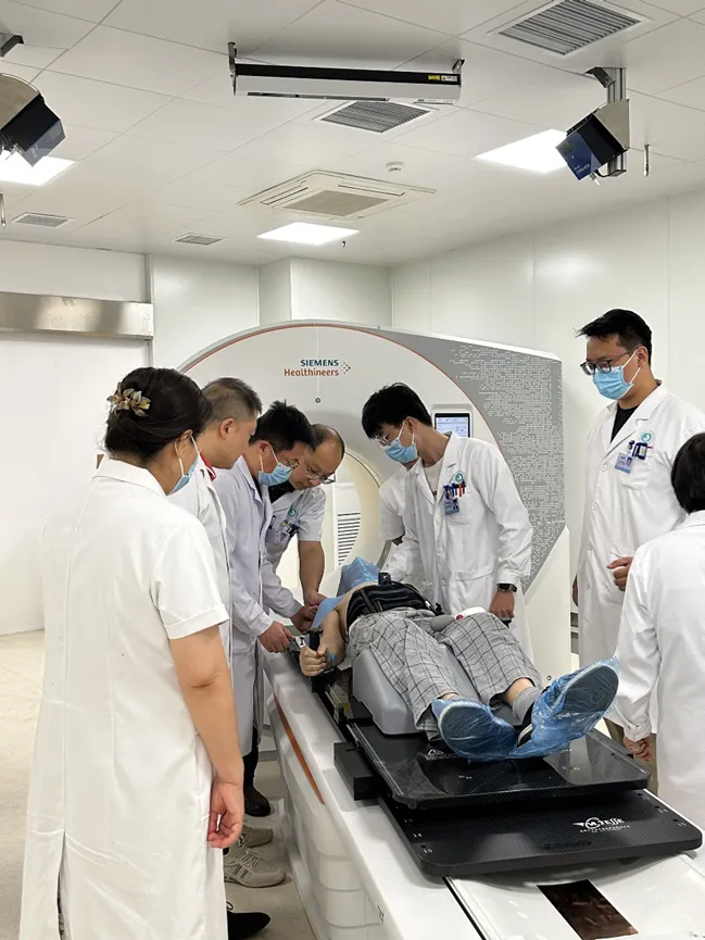 为此,医院放射物理技术科与影像科团队展开协同攻坚:影像科医师及技师在光子的扫描、能谱特征分析等方面积累了丰富的经验,进一步提升肿瘤的精准诊断和分期水平;物理技术团队则借助仿真人模体,反复模拟该定位、计划、治疗流程,通过自主编写代码与开发脚本破解技术难题,保证了患者治疗过程的顺利进行。