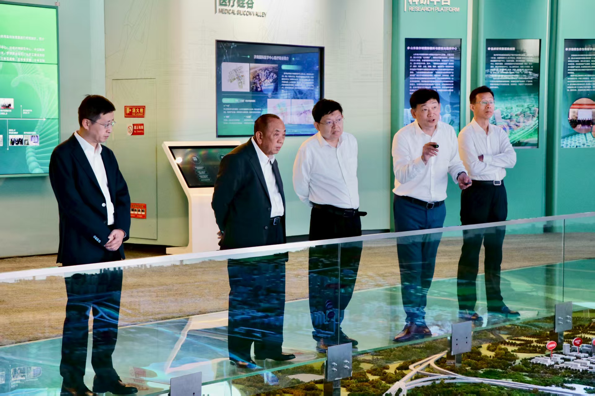 李西廷董事长一行首先来到医学中心综合展厅,详细了解了医学中心整体规划、项目建设、平台打造、产业集聚等情况。随后,车览了医疗硅谷、山东第一医科大学、国家健康医疗大数据中心(北方)等重点项目。