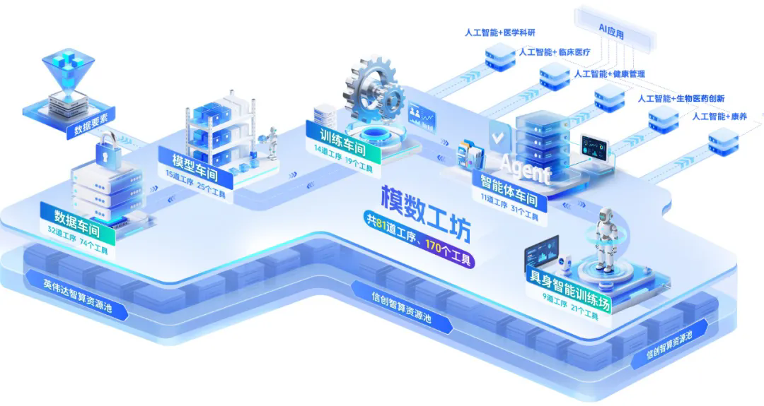 由北方健康全力打造的“模数工坊”被形象地比喻为“数智厨房”,其核心在于建设健康医疗数据要素与人工智能产业创新综合体。聚焦从上游数据供给到下游模型应用的全链条环节,以工厂化生产模式为核心理念,依托完善的工具链,构建标准化、可复用的数据与AI生产流水线,推动健康医疗行业模型与智能体应用的规模化、模块化与智能化生产,加速数据要素向AI应用产品的高效转化,构建覆盖全生命周期的数据要素与人工智能产业赋能体系。