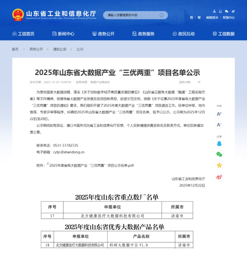 近日,山东省工业和信息化厅发布《2025年山东省大数据产业“三优两重”项目名单公示》。作为济南国际医学中心引入的国家级平台——国家健康医疗大数据中心(北方)的授权运营企业,北方健康再度荣膺“山东省重点数厂”称号。这是自2021年以来北方健康连续第五年获此殊荣,充分彰显了其在我省大数据领域的技术实力和创新能力,为全省大数据产业树立了典范。