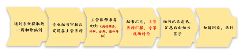 目前,医院成立了由于金明院士为组长的MDT领导小组,在全院遴选肺癌、食管癌、乳腺癌等各个病种的MDT专家组长、专家组成员和各专业组MDT秘书。患者入院后,通过系统提取近一周初诊病例,由专业秘书审核后发送给各主管医师。主管医师根据每位患者的实际病情,制定汇报材料,详细记录患者的病情摘要、诊断、分期、整体评估情况。各专业组每周在固定的时间、固定的地点开展会议MDT,患者的主管医师到场汇报病历,各专家组成员根据患者病情充分讨论,发表专业意见,各专业组秘书负责记录MDT意见,主管医师书写多学科会诊病程,和患者沟通,在患者知情同意后执行会诊意见。