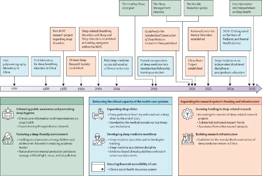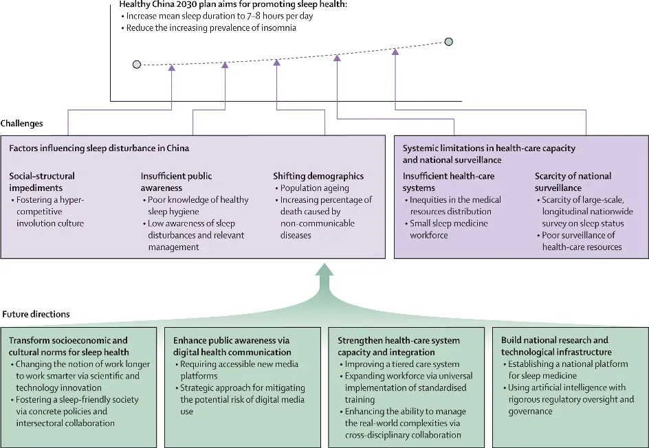 文章深入剖析了现存的挑战,指出挑战主要源于两大方面:一是影响睡眠的深层因素,包括高竞争性的社会文化(“内卷”)、公众对睡眠卫生的认知不足,以及人口老龄化与慢性病负担加剧;二是系统性限制,包括医疗资源(尤其是专业睡眠人才)分布不均,以及缺乏全国性、纵向的睡眠健康动态监测体系。