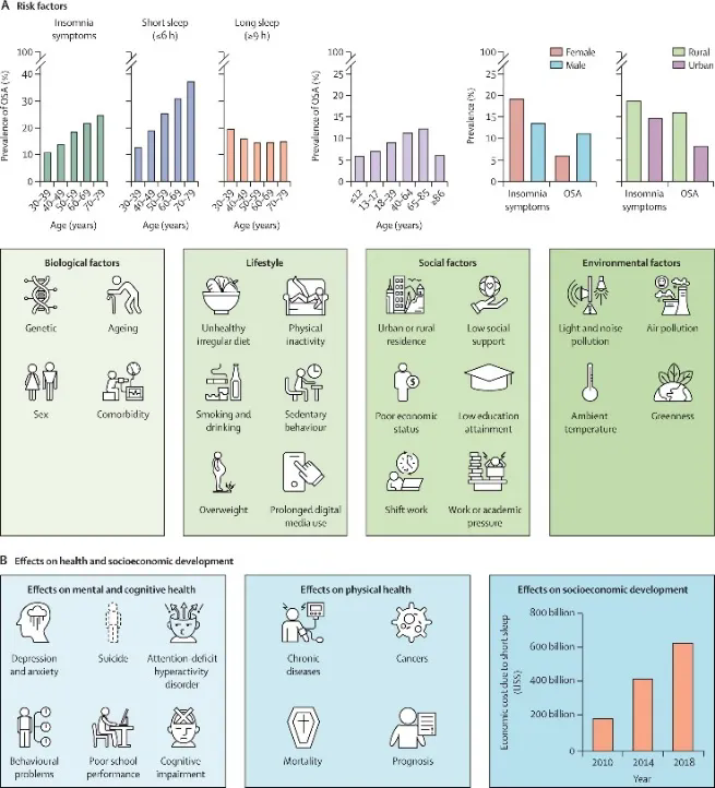 综述首先评估了中国睡眠健康的流行病学现状。文章指出,不良睡眠已给中国的公众健康和经济发展带来了日益沉重的负担。尽管部分研究显示平均睡眠时长有所增加,但失眠和阻塞性睡眠呼吸暂停(OSA)的患病率呈上升趋势,构成了严峻挑战。导致睡眠问题的风险因素复杂多样,涉及生物、生活方式、社会和环境四大领域。睡眠障碍对身心健康具有深远影响,不仅显著增加抑郁、焦虑、认知损害等精神健康问题的风险,还会加剧心血管疾病、癌症等多种慢性躯体疾病的发生率与死亡率。