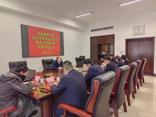 2月21日下午,市政府研究室召开2022年度党支部书记抓基层党建工作述职评议会议,总结成绩,查找不足,对抓基层党建工作进行安排部署,推动基层党建责任制落实落地。市政府研究室党组副书记、副主任,机关党总支书记潘大海主持会议并讲话,各党支部书记及普通党员代表参加会议。