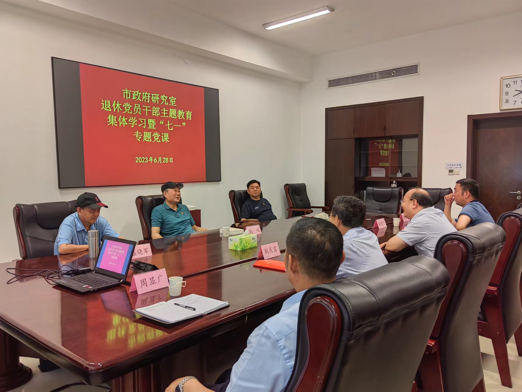 为庆祝中国共产党建党102周年,扎实推动学习贯彻习近平新时代中国特色社会主义思想主题教育走深走实,丰富退休干部党建活动,6月28日,市政府研究室组织机关退休干部党员开展主题教育集体学习和专题研讨。研究室有关党组成员参加会议。