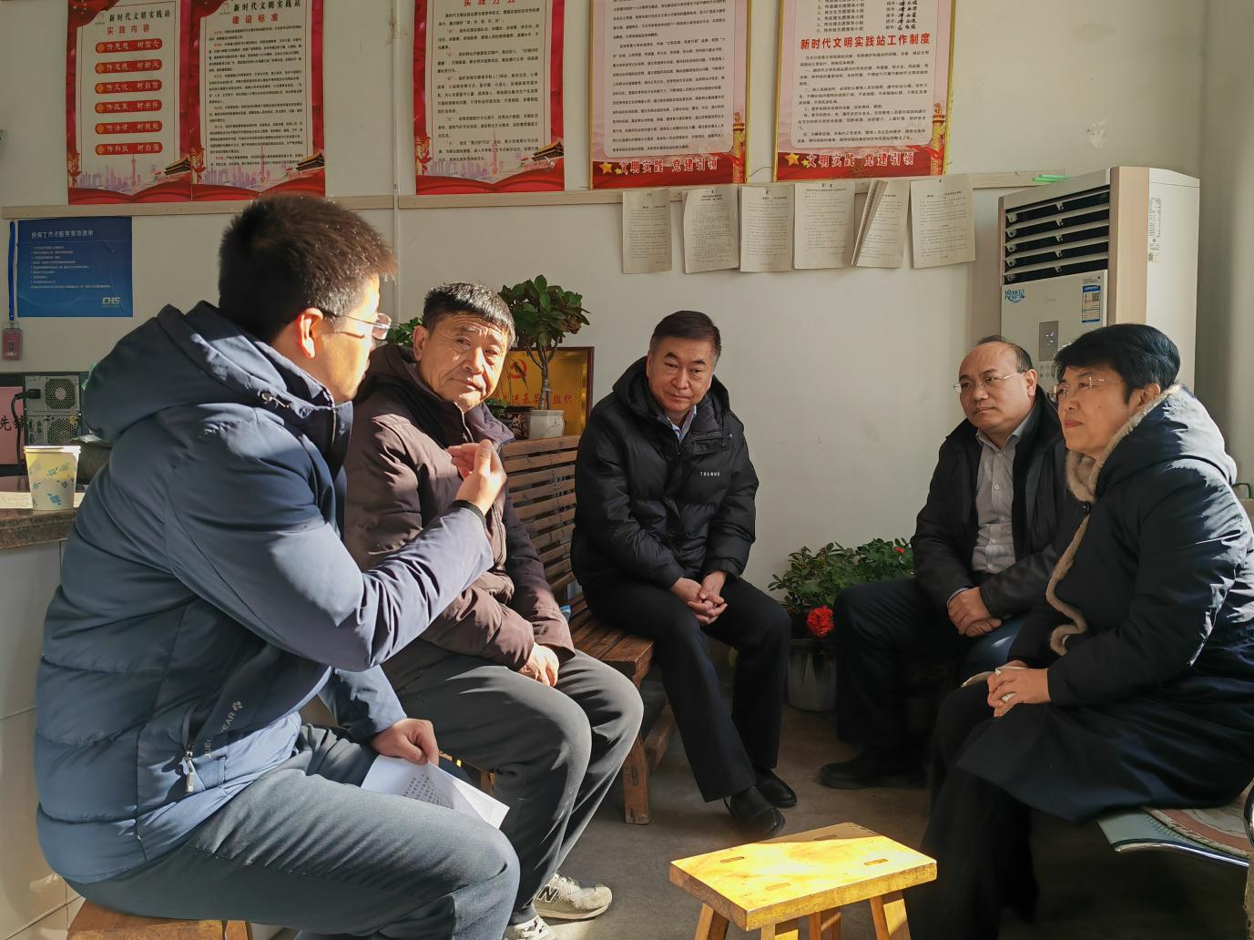 石玮一行与村“两委”干部及驻村第一书记马金鑫进行座谈交流,详细听取了驻村工作开展情况、村集体经济发展情况以及当前面临的具体困难和问题,对下一步工作提出意见建议。要坚持政治统领、党建引领,充分发挥村党支部战斗堡垒和党员先锋模范作用,大力发扬艰苦奋斗精神,强化责任意识和使命担当,以实际行动做好服务群众工作;要充分论证产业发展方案,带领群众趟出一条致富路,在增加集体收入、提高村民生活水平上下功夫;要结合实际,想方设法为村内老人提供好助餐服务;要开展精神文明建设,改善村容村貌,打造美丽宜居村庄,让村民生活的更加舒心。