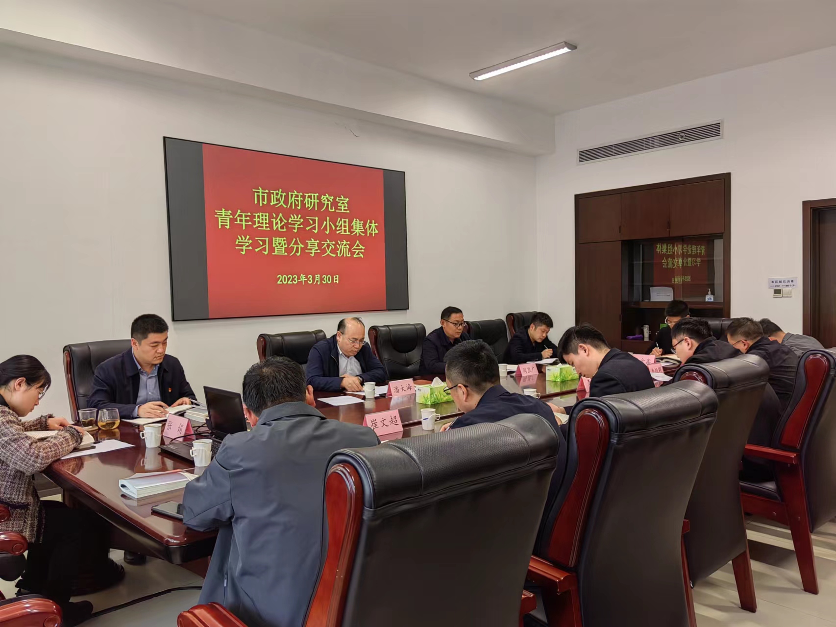 为深入学习贯彻习近平新时代中国特色社会主义思想和党的二十大精神,进一步提升青年干部政治素养和理论水平,3月30日下午,市政府研究室开展了以“共学二十大 建功新时代”为主题的青年干部集体学习和分享交流活动。研究室党组副书记、副主任潘大海主持会议并进行导学。