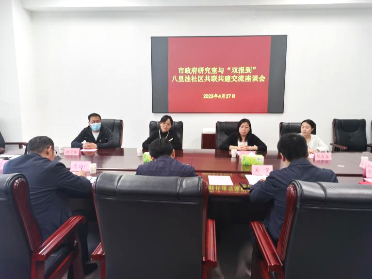 在随后召开的座谈会上,八里洼社区介绍了社区有关情况,双方就社区环境提升、物业管理、集体经济发展等方面进行了深入交流,市政府研究室机关党总支负责同志就省市区联合开展“荔枝”社区志愿慰老服务队活动提出建议。