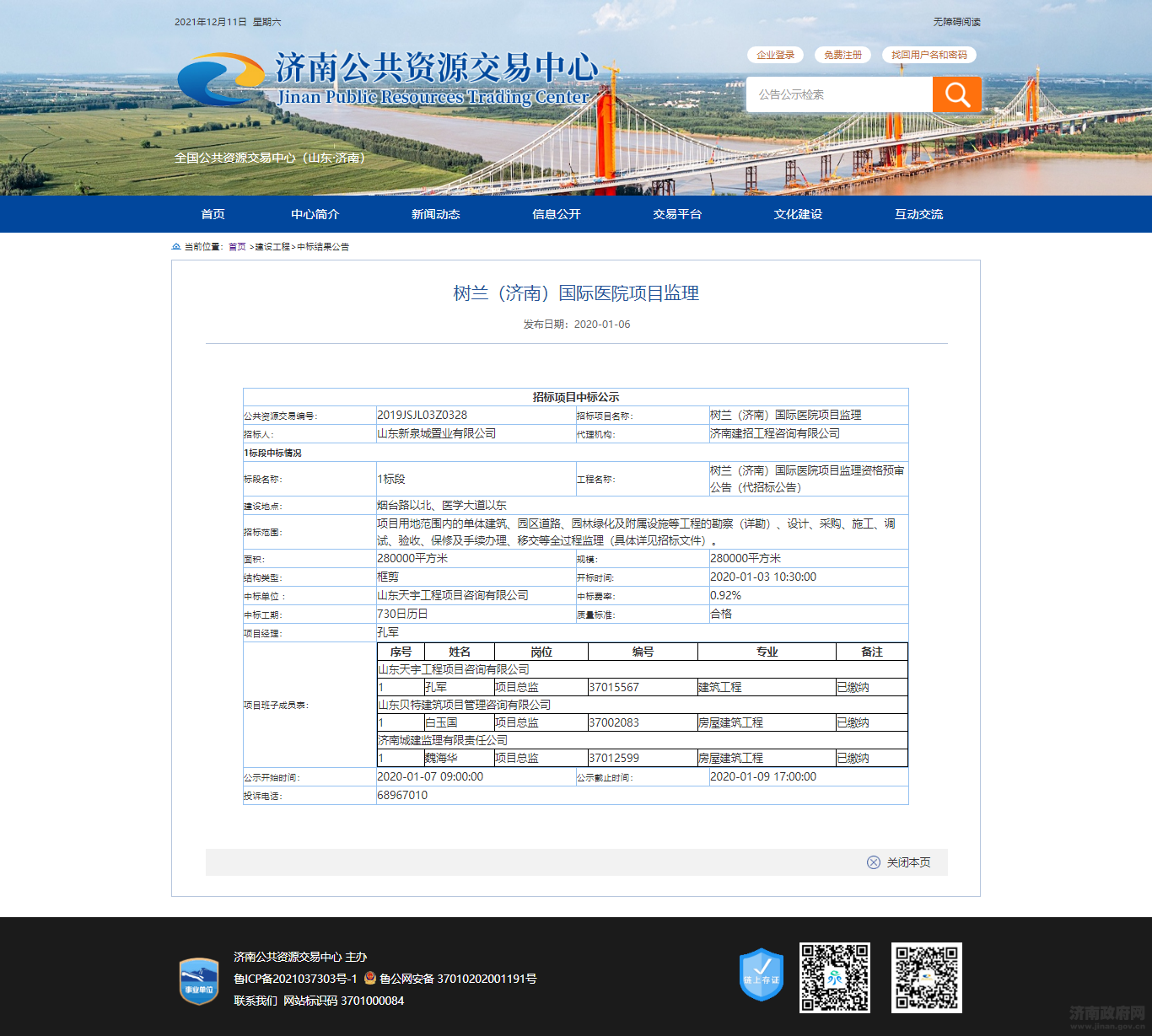树兰(济南)国际医院项目监理中标公示