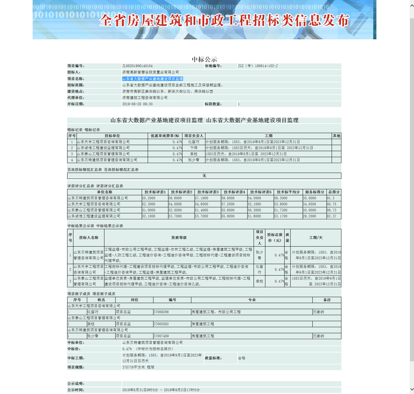 山东省大数据产业基地建设项目监理中标公示 发布日期:2021-12-10 17:22 信息来源:济南市政府门户网站 浏览次数:次 字体:【 默认 大 超大 】 山东省大数据产业基地建设项目监理中标公示 【打印本页】 【关闭窗口】
